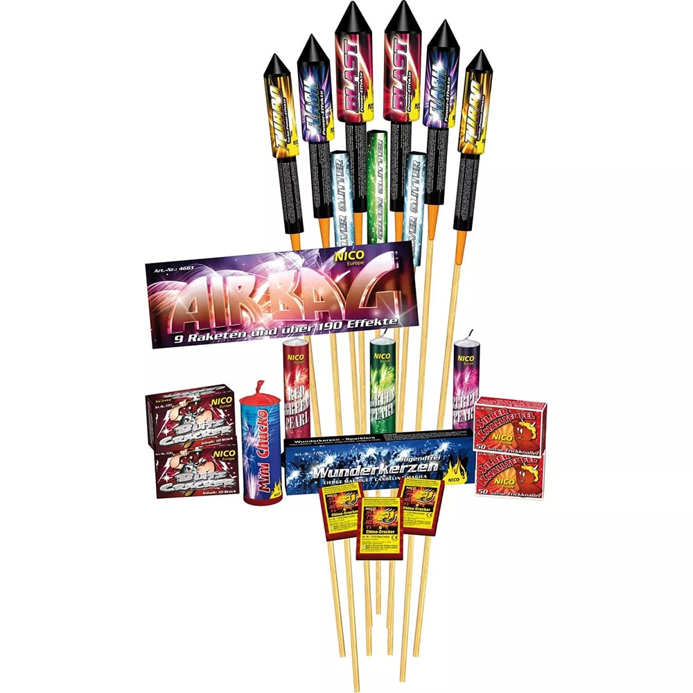 Das Action-Sortiment mit jeder Menge Nervenkitzel! Unter anderem mit 9 Raketen und unzähligen Sprüh-, Knall- und Blitzeffekten